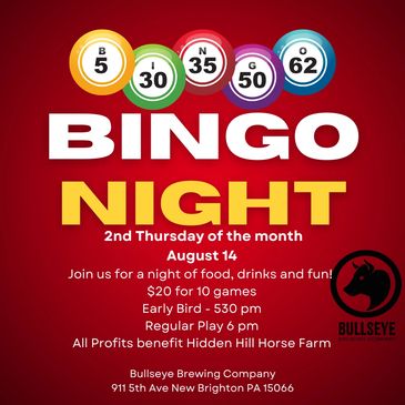 Hidden Hill Horse farm is hosting Bingo the second Thursday of the month. August 14 is the next event.